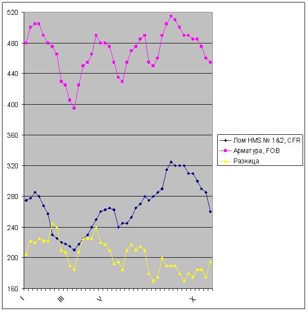 Глубина спада на рынке металлолома будет зависеть, прежде всего, от положения дел на ближневосточном рынке готового проката. В течение 2009 года разница в цене между металлоломом HMS № 1&2/А3 CFR Турция и арматурой FOB Турция в основном варьировалась между $180 и $230 за т. Судя по всему, турецкие производители длинномерной продукции в настоящее время стараются удержать арматуру от спада до менее $450 за т FOB, в связи с этим объективных предпосылок для провала лома до менее $230-250 за т CFR Турция, в принципе, нет. При этом, надо учитывать и то, что турецкие металлурги не совершали крупных операций с металлоломом с первой половины сентября, так что запасы сырья у них невелики. Можно рассчитывать на то, что в ноябре турки возобновят закупки лома и тем самым помогут ценам стабилизироваться.