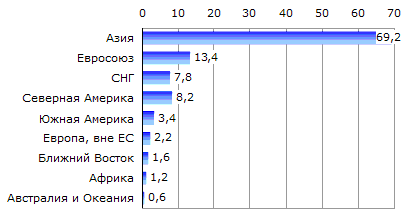 Китай в феврале 2010 года выпустил 50,36 млн.тонн стали, обеспечив почти 47% мирового производства. Россия с объемами производства на уровне 4,69 млн.тонн снизила свою долю в мировом производстве с 4,8% в январе до 4,4% в феврале 2010 года.