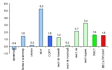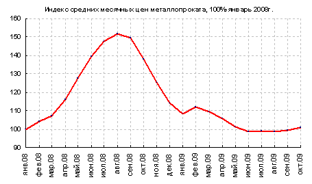 За четыре недели с 05.10.09 по 01.11.09 общий индекс средних недельных рублевых рыночных цен металлопроката вырос на 0,5%. Индекс средних недельных цен сортового проката снизился на 0,2%. По отдельным видам сортового проката изменение цен составило: